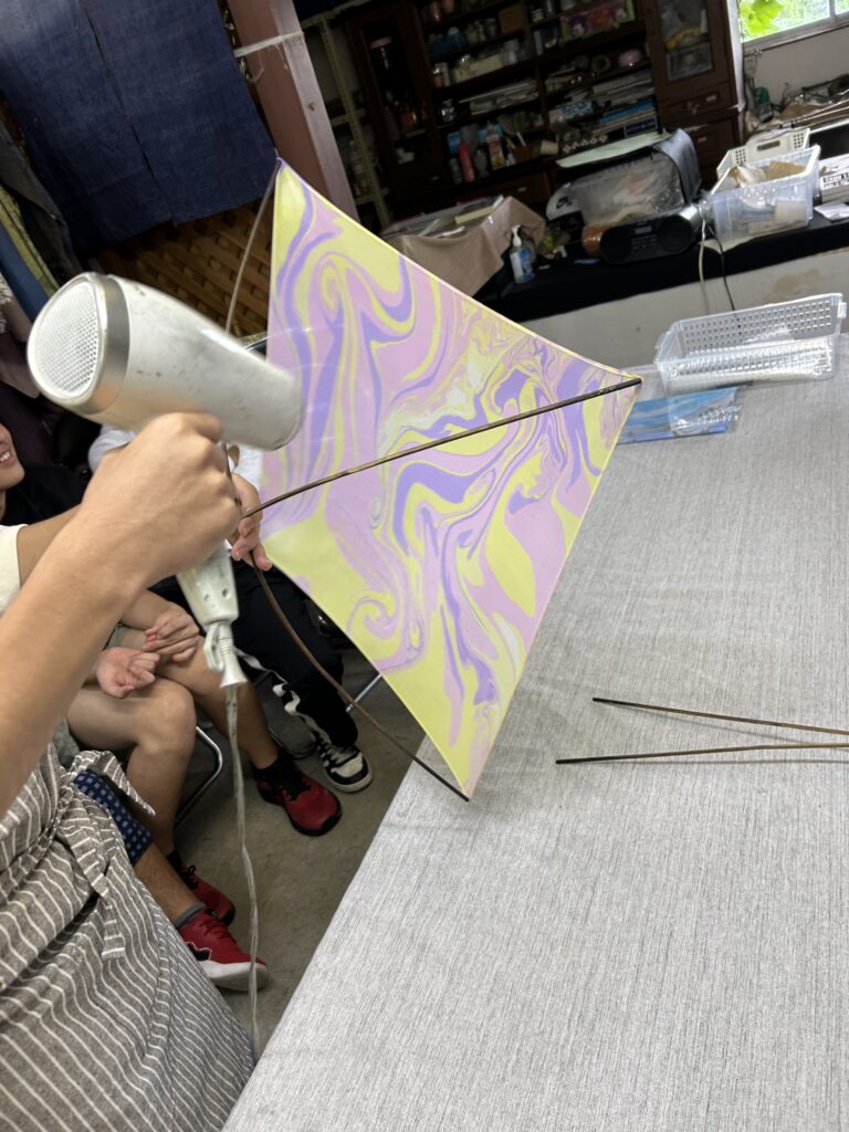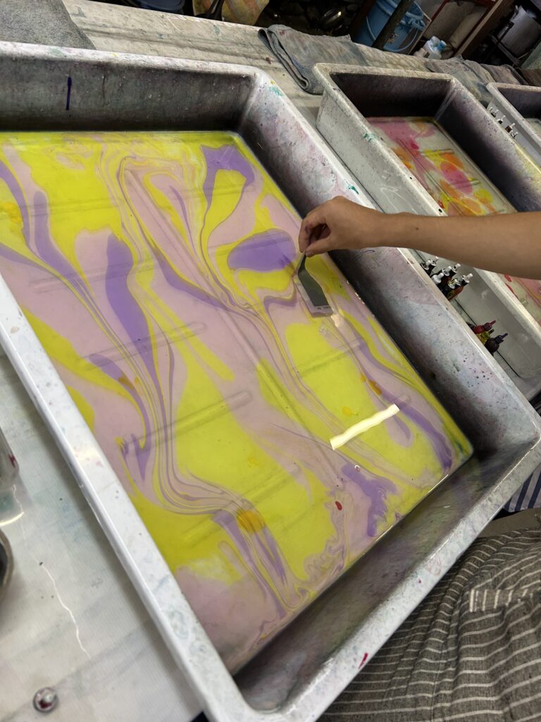 墨流しはんかちでは、色を3色決め、水の動きで柄を作りました(水の呼吸 壱ノ型 柄作り🌊🌀)