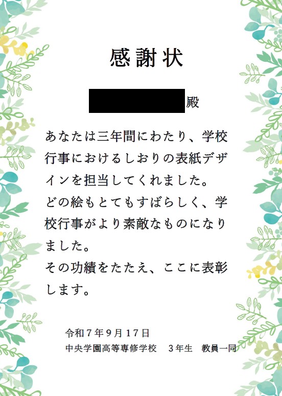 社会見学、宿泊研修、修学旅行など、今までの行事でしおりの表紙デザインを毎回担当してくれた生徒に、教員から感謝状を送りました。毎回センスあふれる素敵な表紙でした、3年間ありがとう!